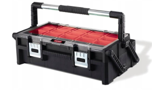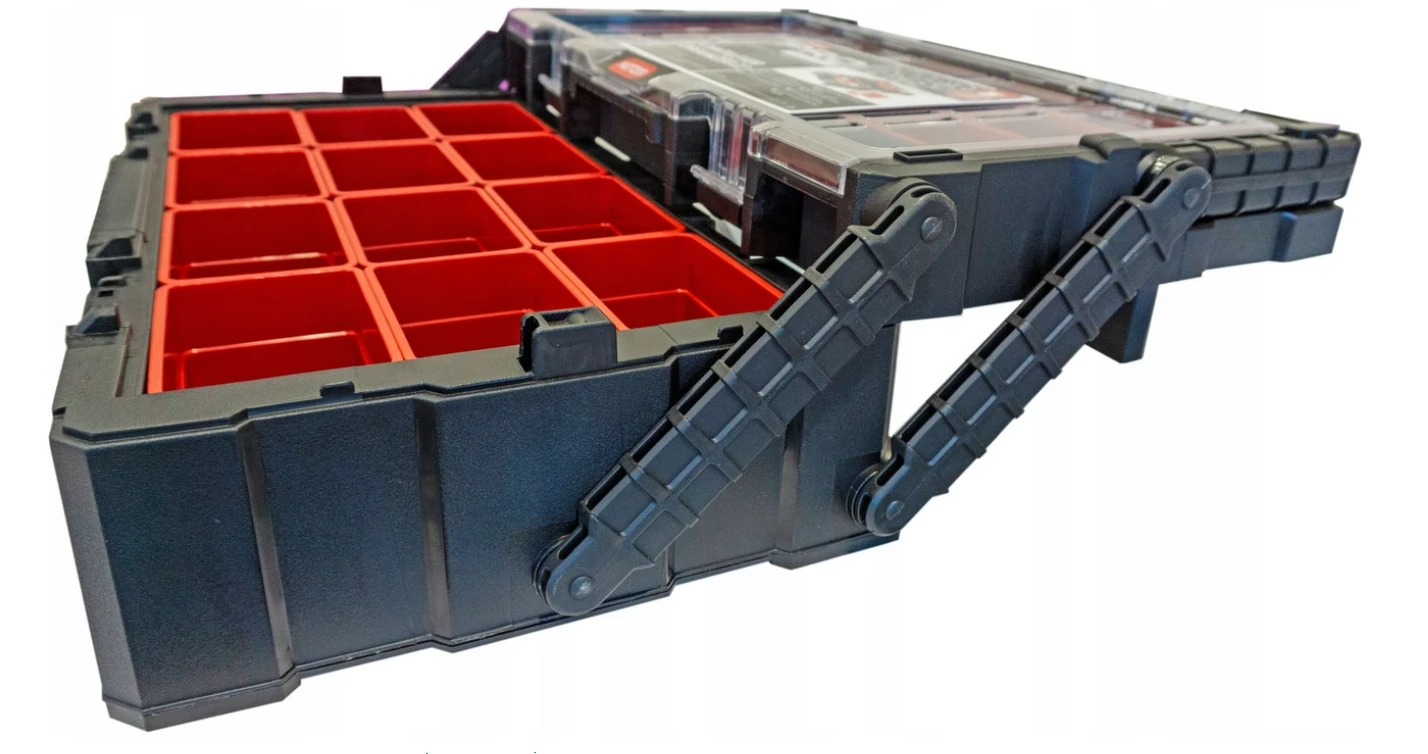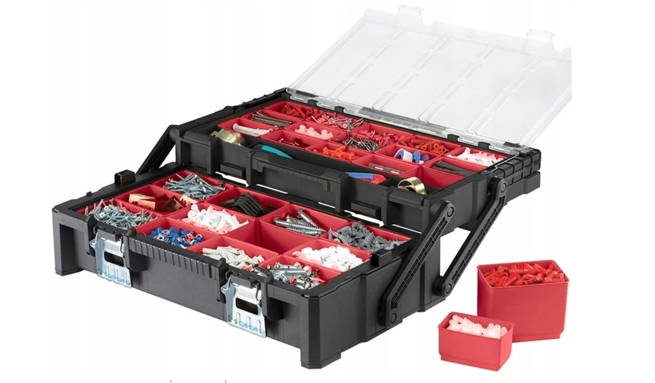 Praktyczny organizer narzędziowy z mechanizmem cantilever, zaprojektowany z myślą o wygodnym przechowywaniu drobnych akcesoriów, elementów montażowych i podręcznych narzędzi w uporządkowanym układzie.