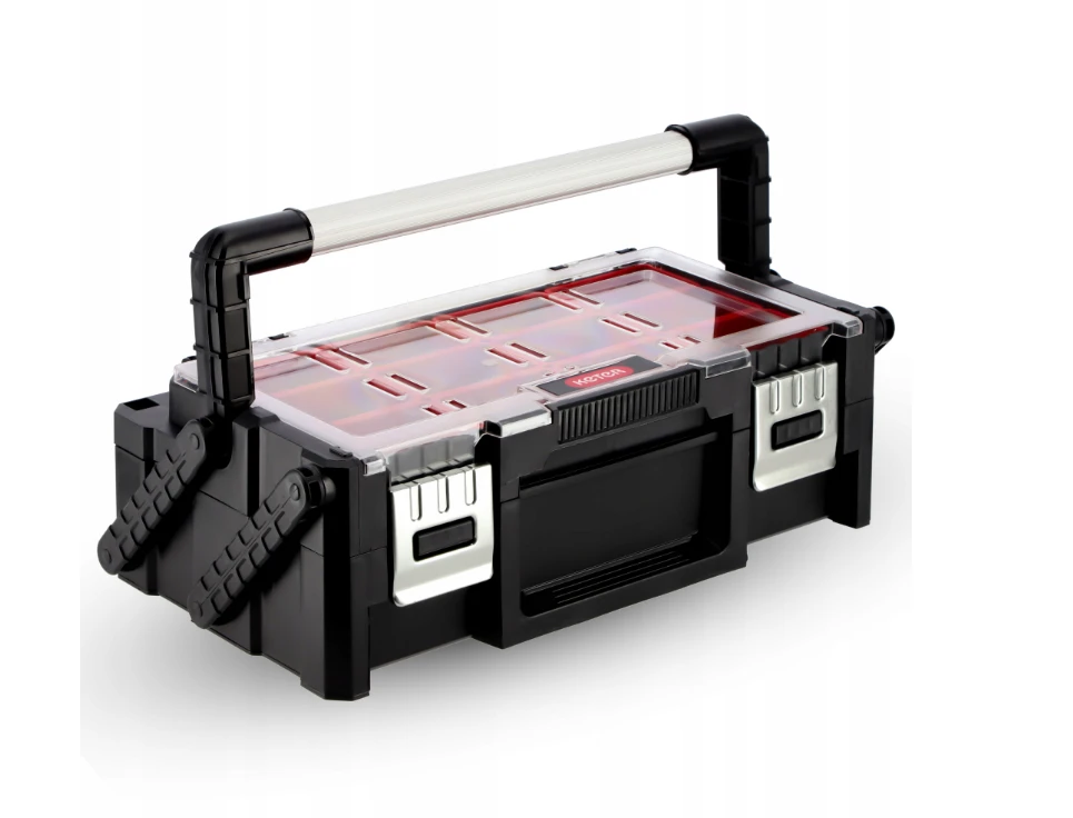 Dwupoziomowy organizer narzędziowy zaprojektowany z myślą o wygodnym przechowywaniu drobnych akcesoriów, elementów montażowych i podręcznych narzędzi w uporządkowanym, łatwo dostępnym układzie.