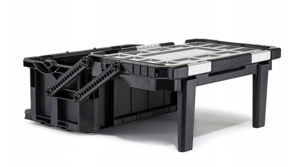 Funkcjonalna skrzynka narzędziowa z mechanizmem cantilever, zaprojektowana z myślą o wygodnym przechowywaniu większych narzędzi, akcesoriów roboczych i drobnych elementów w jednym, dobrze zorganizowanym systemie.