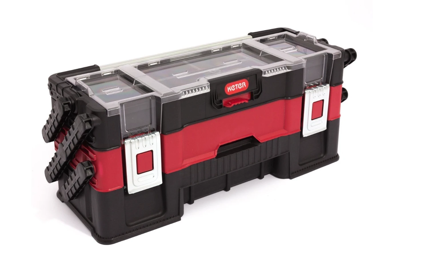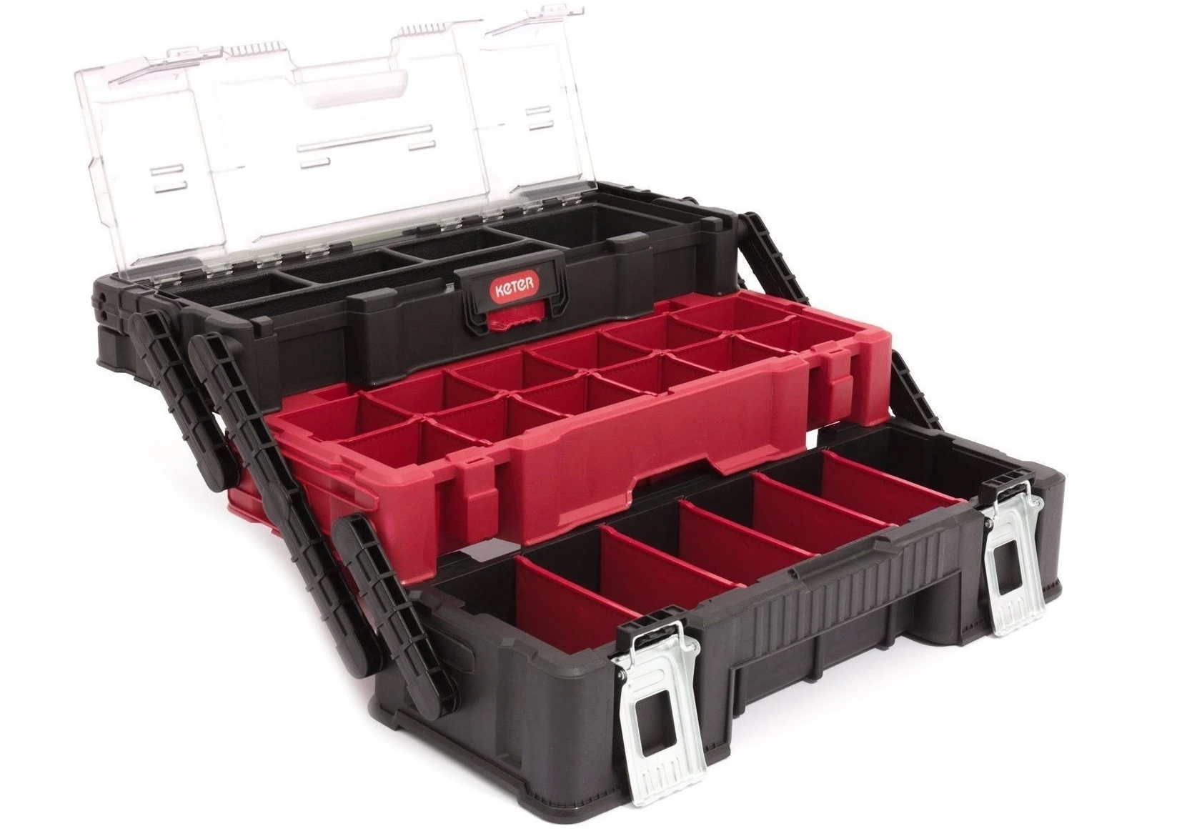 Trzypoziomowy organizer narzędziowy zaprojektowany z myślą o wygodnym przechowywaniu drobnych akcesoriów, elementów montażowych i podręcznych narzędzi w uporządkowanym, łatwo dostępnym układzie.
