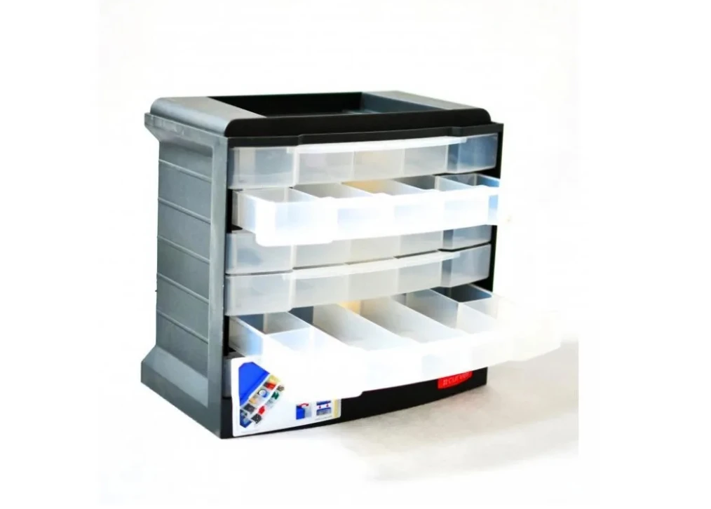 Funkcjonalny organizer warsztatowy z wysuwanymi szufladami do wygodnego przechowywania śrubek, gwoździ, kołków i innych drobnych akcesoriów.