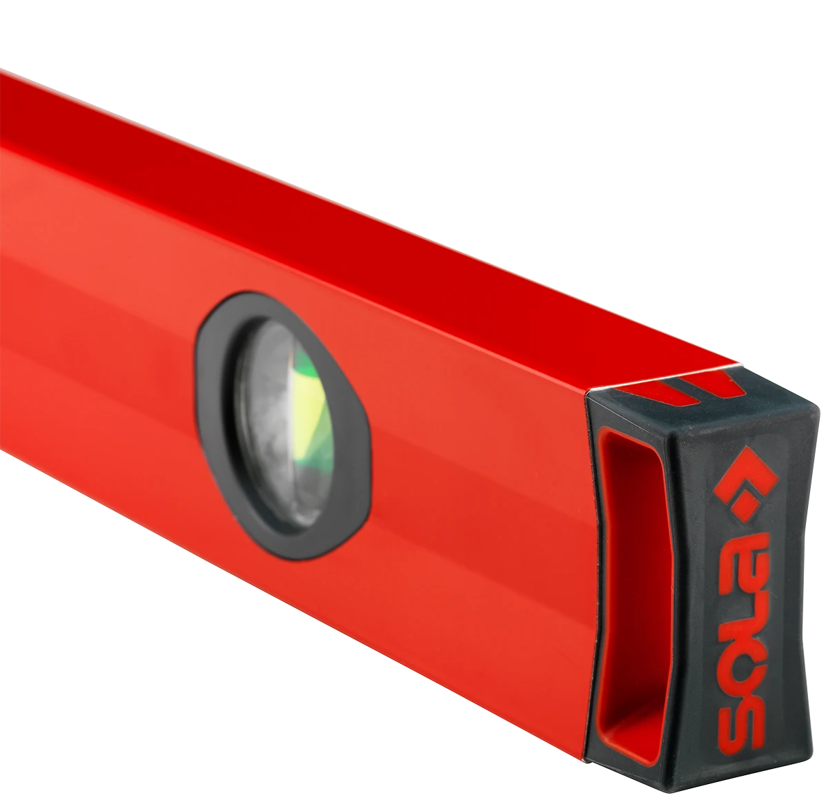 Model SOLA BIG X 60 został wykonany z aluminiowego profilu skrzynkowego typu X o wymiarach około 52 × 25 mm. Powlekana powierzchnia w czerwonym kolorze zwiększa trwałość narzędzia i nadaje mu wyrazisty, profesjonalny wygląd. Dzięki kompaktowej, ale uniwersalnej długości 60 cm poziomica dobrze sprawdza się przy pracach montażowych, instalacyjnych oraz remontowych.