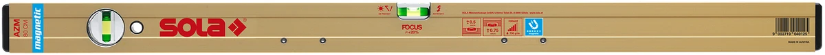Model SOLA AZM 180 został wykonany z wytrzymałego profilu aluminiowego o wymiarach 50 × 24 mm i anodowanej, złotej powierzchni. Poziomica należy do serii magnetycznych poziomic skrzynkowych, a zastosowane magnesy neodymowe zwiększają komfort pracy przy konstrukcjach metalowych, montażu oraz instalacjach. Producent potwierdza dla długości 180 cm obecność magnesów neodymowych, a źródła handlowe wskazują na 8 wbudowanych magnesów.