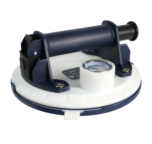 Przyssawka została wyposażona w manometr wskazujący siłę podciśnienia oraz mechaniczny zawór spustowy. To praktyczne rozwiązanie dla osób, które potrzebują większej kontroli i bezpieczeństwa podczas transportu cięższych elementów w codziennej pracy glazurniczej, budowlanej i kamieniarskiej.