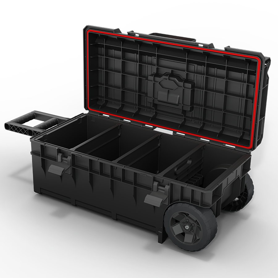 Mobilna skrzynia narzędziowa o ponadstandardowej długości, zaprojektowana do wygodnego transportu długich elektronarzędzi, akcesoriów i wyposażenia roboczego.