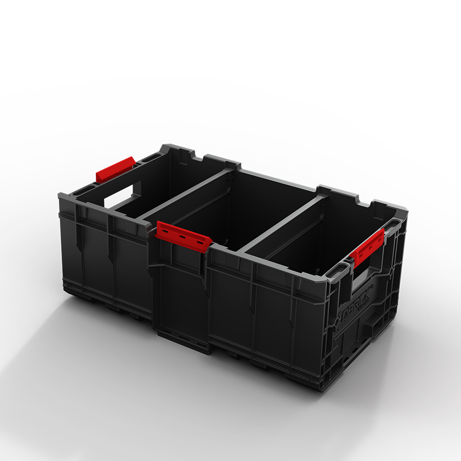 Otwarty pojemnik systemowy zaprojektowany do wygodnego przechowywania, transportu i szybkiego dostępu do narzędzi oraz akcesoriów podczas codziennej pracy.