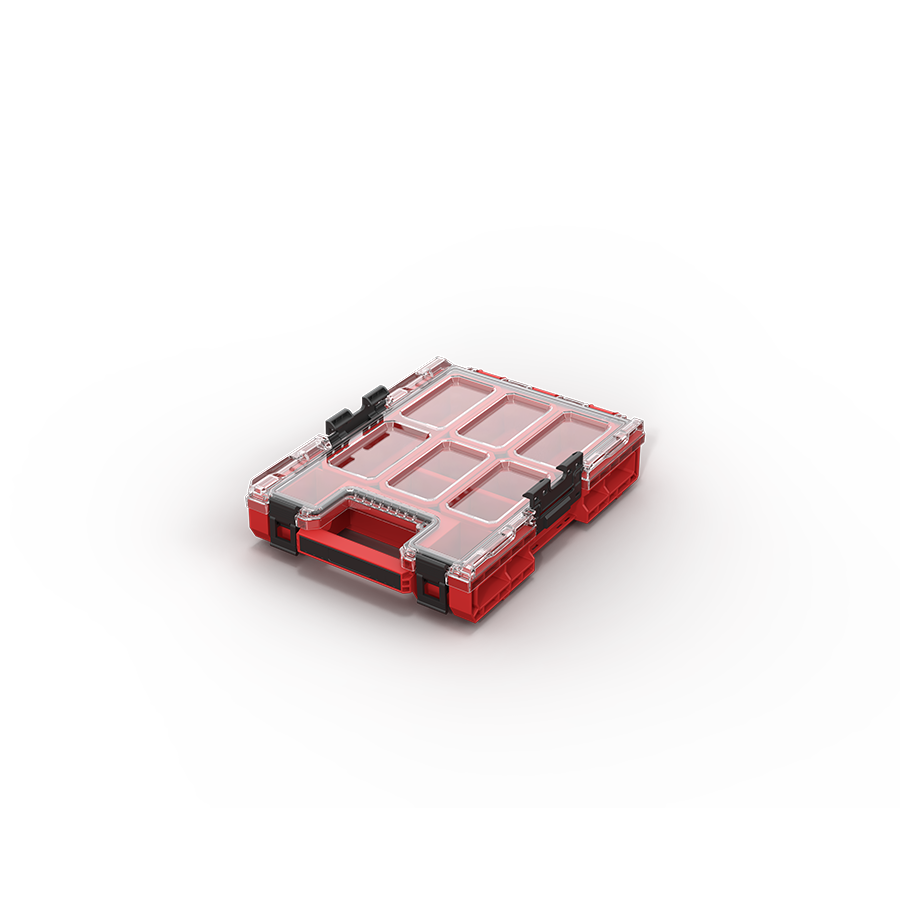 Kompaktowy organizer modułowy z serii RED ULTRA HD, wyposażony w system Easy Access, uszczelnioną pokrywę i praktyczny układ kubełków, zaprojektowany do wygodnego przechowywania oraz transportu drobnych akcesoriów i podłużnych elementów roboczych.