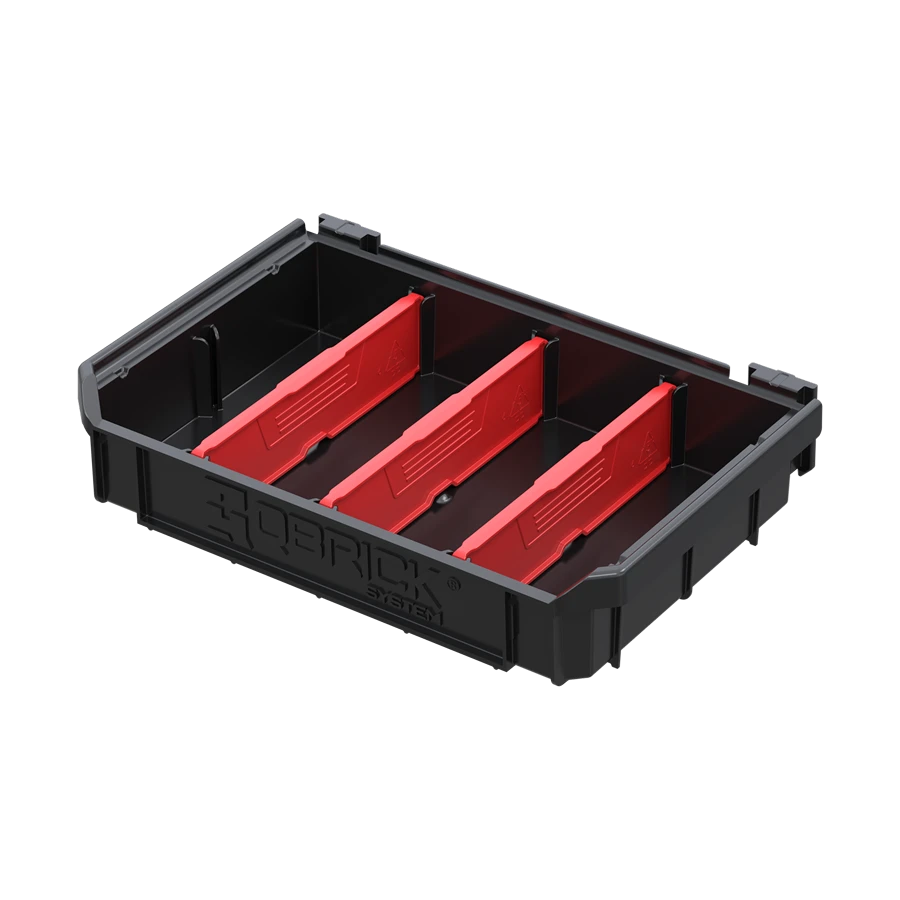 Regulowane przegrody pozwalają lepiej zagospodarować przestrzeń odkładczą i dostosować układ wnętrza do przechowywanych przedmiotów. Dzięki akcesoriom Custom Connectors półkę można wygodnie zawieszać na wybranych skrzyniach, szufladach, organizerach i koszach z linii Qbrick System ONE, PRIME oraz PRO, a także montować na ścianie lub na płycie Qbrick System Custom Pegboard. To funkcjonalne rozwiązanie dla osób, które chcą stworzyć spójny i modułowy system organizacji miejsca pracy.