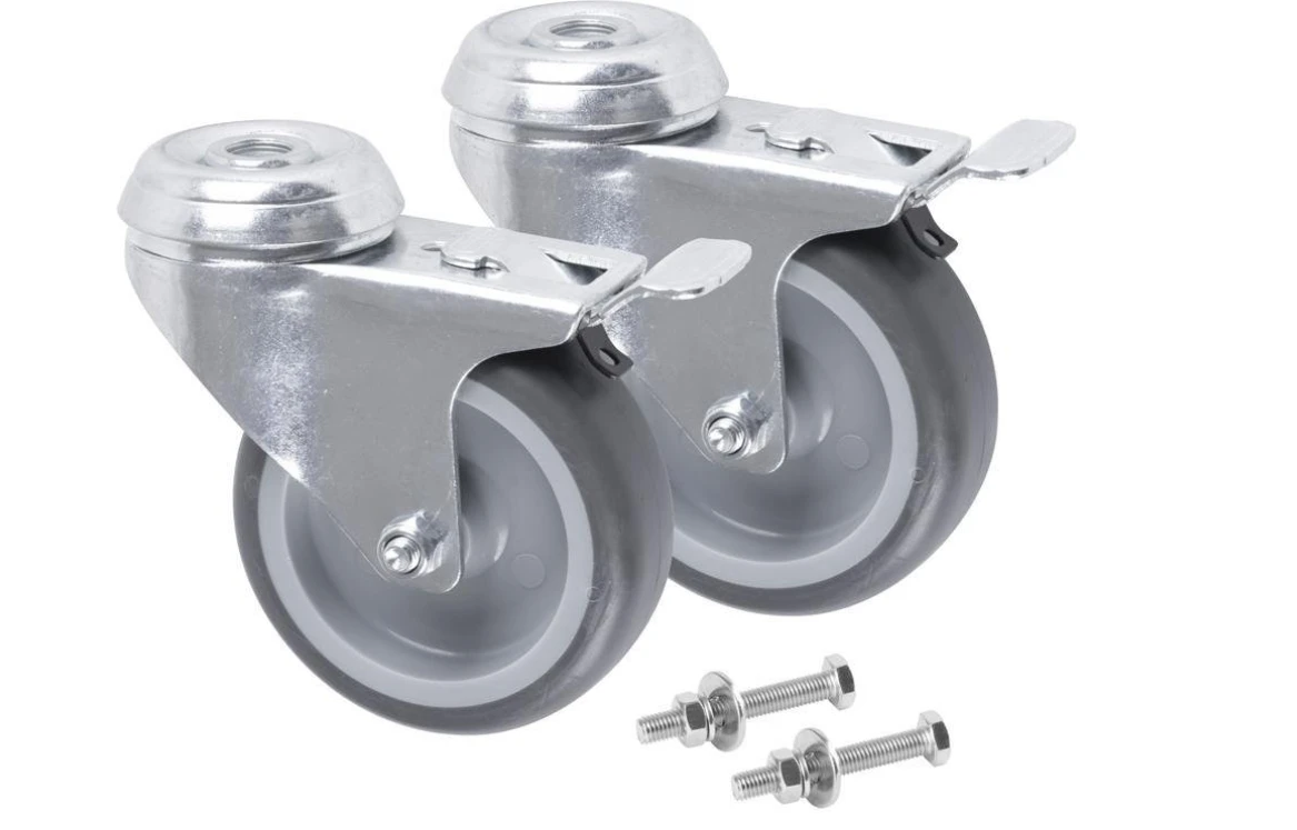 Zestaw kół z hamulcem do platform transportowych Qbrick, który pozwala przywrócić mobilność systemu i zwiększyć stabilność zestawu podczas postoju.