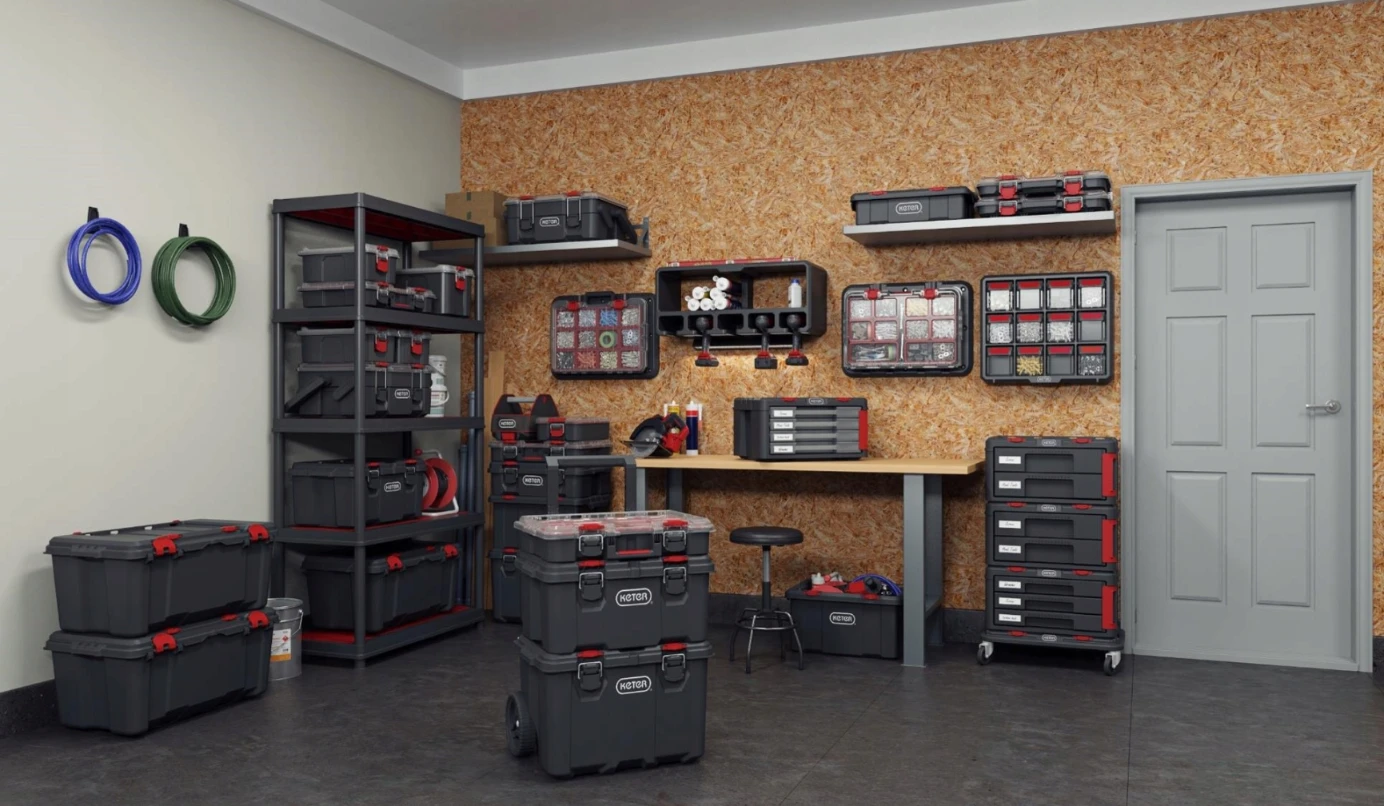skrzynka na kółkach Keter Stack'N'Roll, mobilna skrzynka narzędziowa, skrzynka na narzędzia Keter, system Stack'N'Roll, pojemna skrzynka warsztatowa, transport narzędzi, skrzynka z rączką teleskopową
