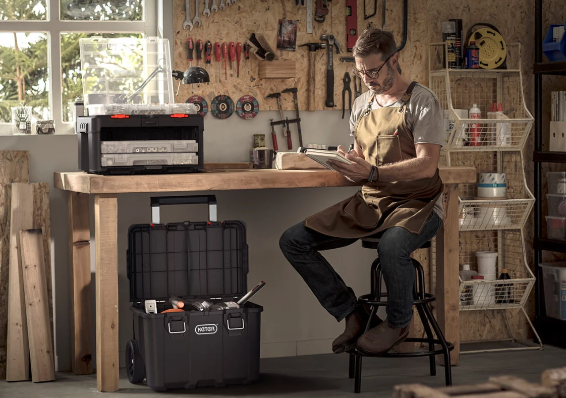 Mobilna skrzynka narzędziowa o dużej pojemności, zaprojektowana do wygodnego transportu narzędzi i akcesoriów roboczych.