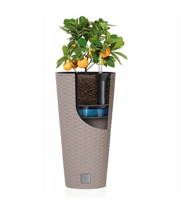 Zestaw obejmuje element nawadniający ze wskaźnikiem poziomu wody oraz lejkiem do wygodnego uzupełniania wody. To praktyczne rozwiązanie do codziennego użytkowania w domu, na balkonie, tarasie i w ogrodzie, szczególnie przy większych donicach okrągłych.