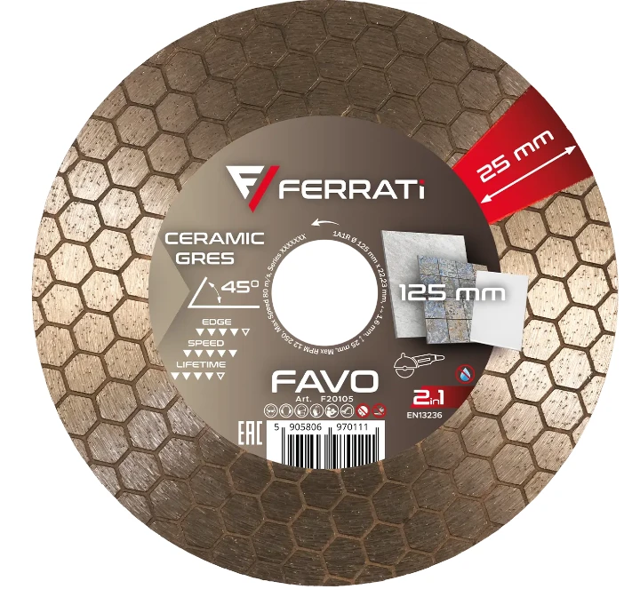 Model Ferrati FAVO F20105 został stworzony do cięcia i okazjonalnego szlifowania bocznego ceramiki oraz gresu. Diamentowa warstwa robocza pozwala nie tylko ciąć materiał, ale także delikatnie wygładzać krawędź po cięciu, co poprawia efekt końcowy i zwiększa wygodę pracy.