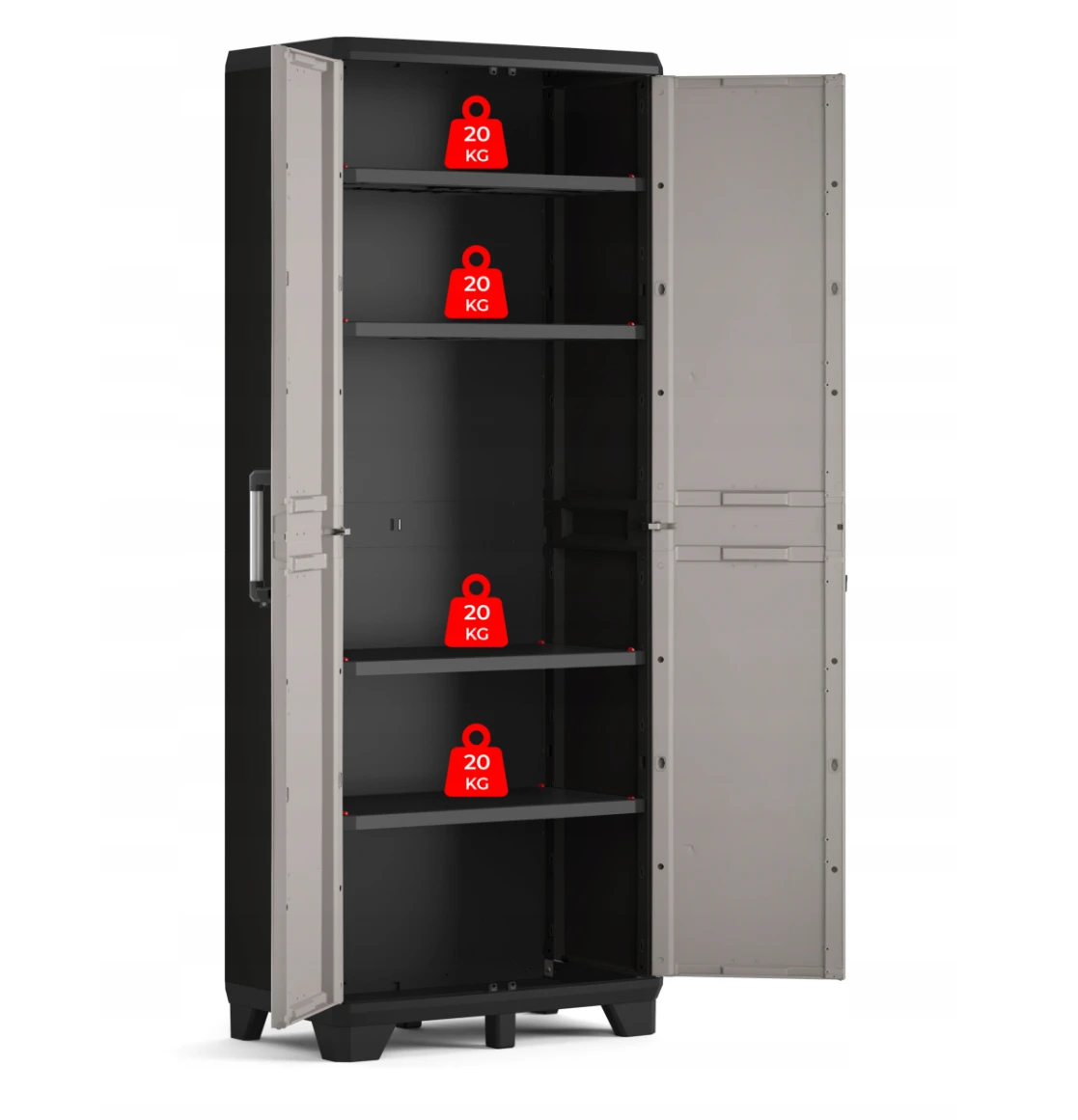 Wysoka szafa gospodarcza Keter PRO to praktyczny wybór dla osób, które chcą uporządkować przestrzeń i wygodnie przechowywać potrzebne wyposażenie w jednym miejscu. To funkcjonalny model, który pomaga utrzymać porządek zarówno w domu, jak i w strefie roboczej.
