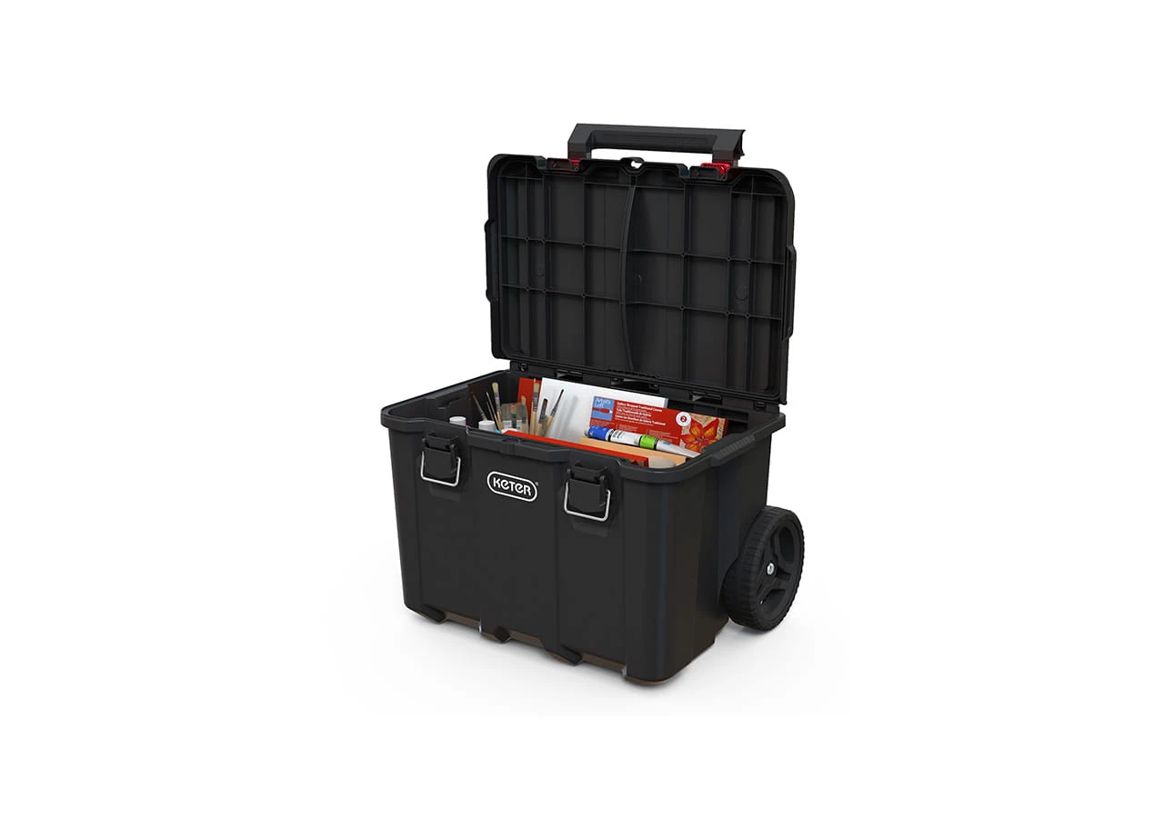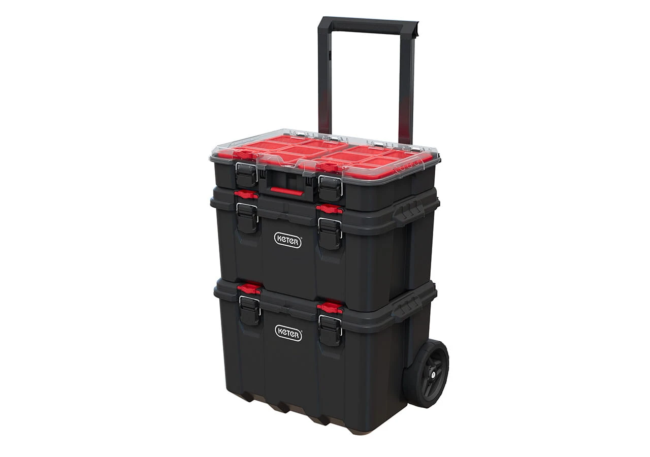 Zestaw 3 skrzynek Keter Stack'N'Roll to praktyczny wybór dla osób, które chcą wygodnie przechowywać i transportować narzędzia w funkcjonalnym systemie modułowym.