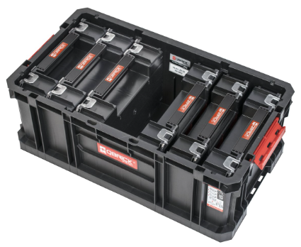 Pojemny, modułowy box narzędziowy w praktycznym zestawie z 6 organizerami Multi, stworzony do wygodnego transportu narzędzi, akcesoriów i drobnych elementów montażowych.